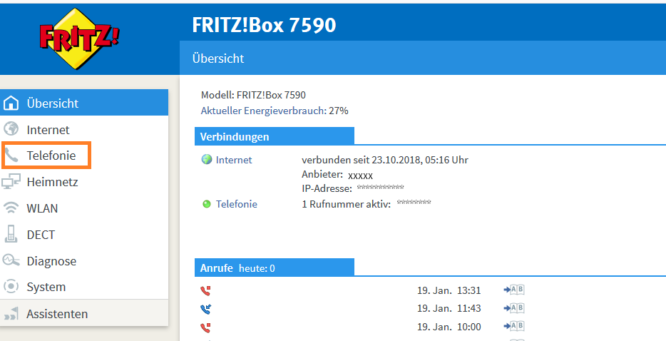 1. Klicken Sie in der Benutzeroberfläche der FRITZ!Box links in der Menüleiste auf „Telefonie“.