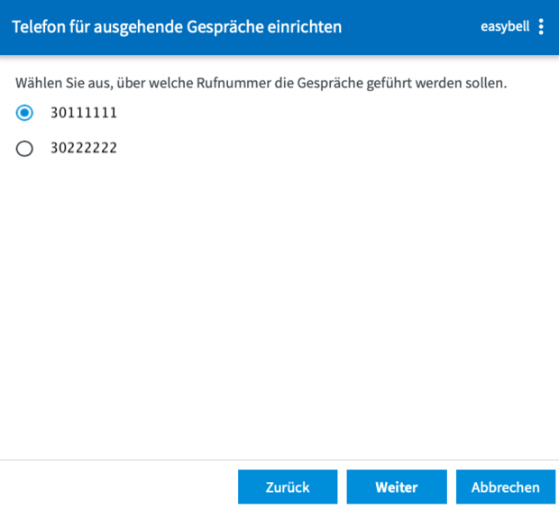 5. Wählen Sie die Rufnummer aus, die Sie zuvor für Ihr registriertes Endgerät übernommen hatten. Über diese werden dann alle ausgehenden Gespräche über das Telefon geführt. Klicken Sie anschließend auf „Weiter“.