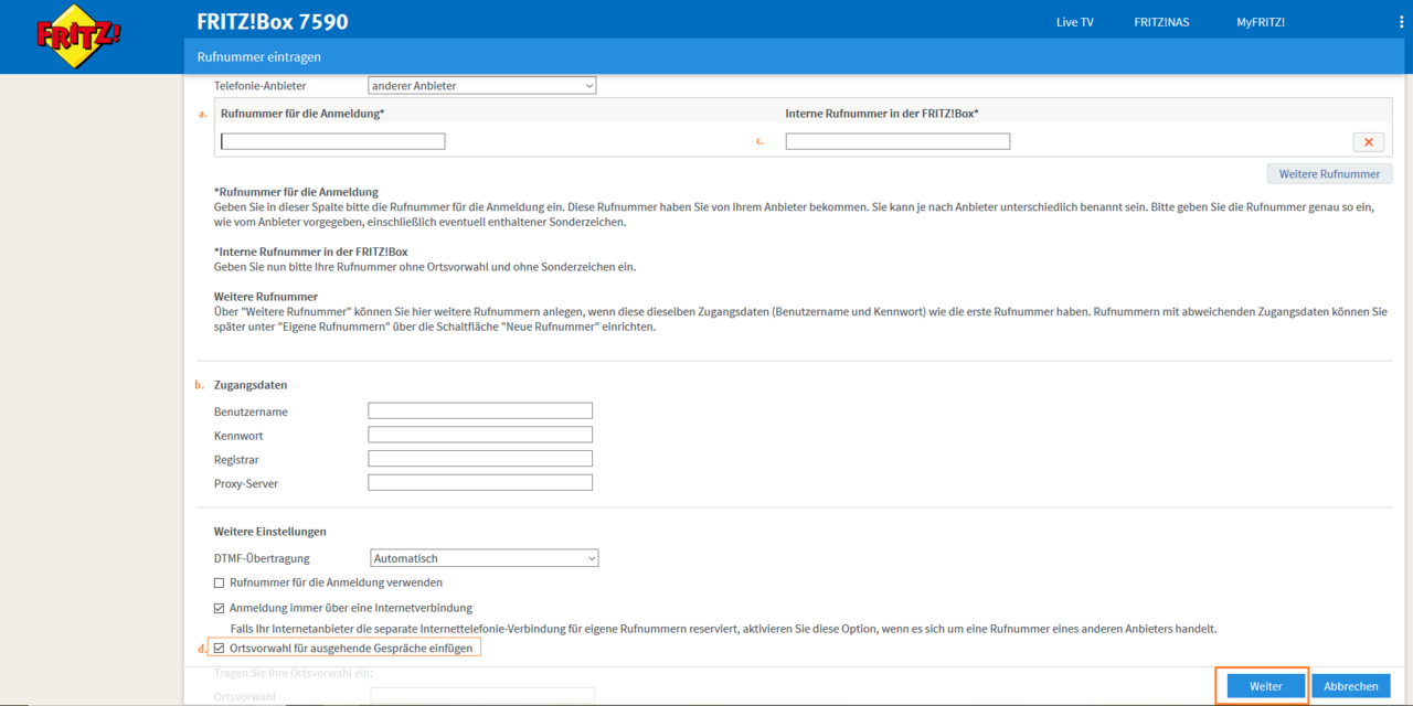 d. Ortsvorwahl für ausgehende Gespräche einfügen: Entfernen Sie bitte den Haken.
