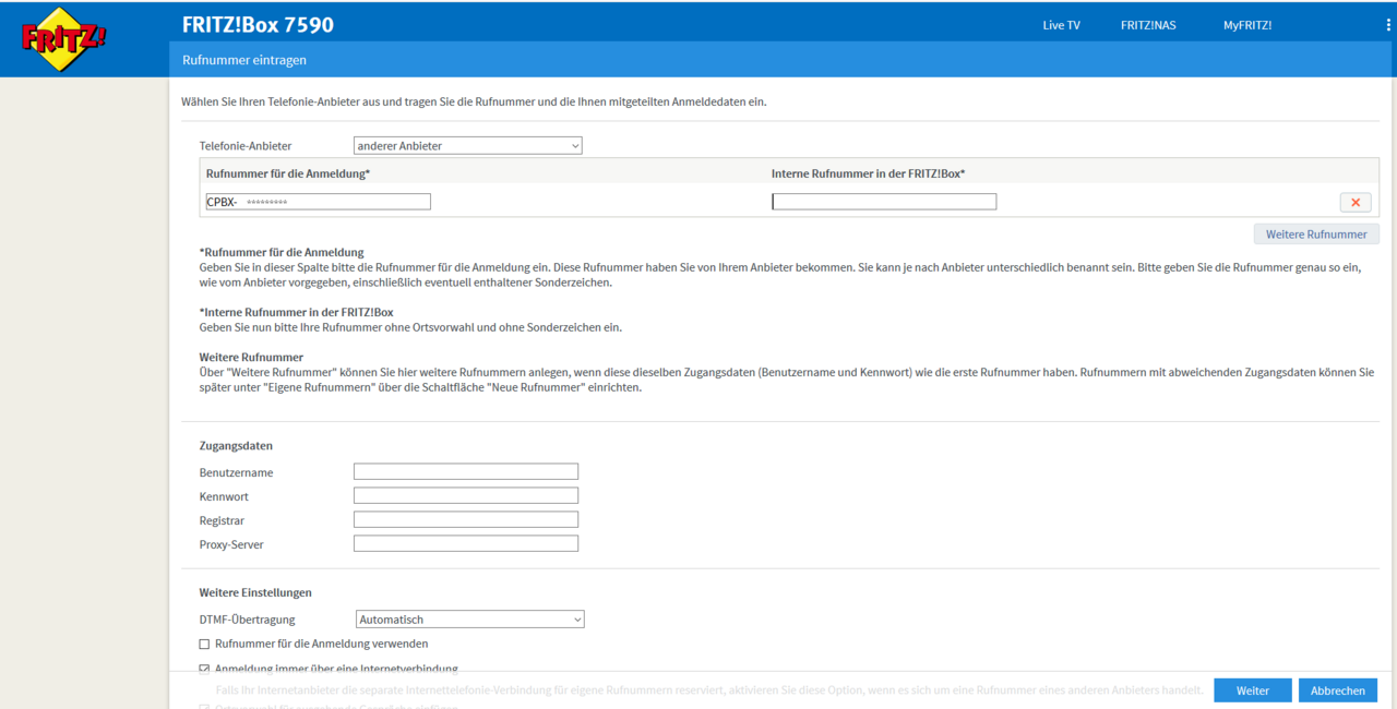 a. Rufnummer für die Anmeldung: der SIP-Benutzername (beginnend mit CPBX-)