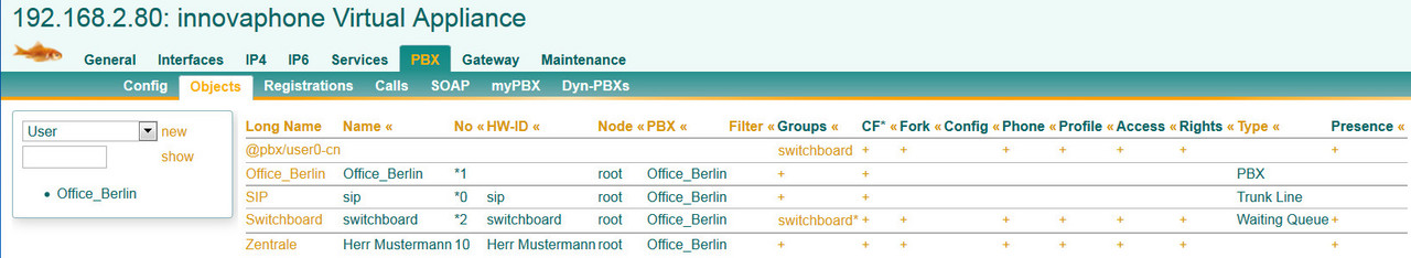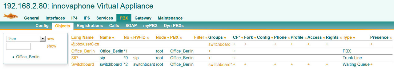 - Wechseln Sie zu den Objekten und erstellen Sie einen neuen User „sip“.