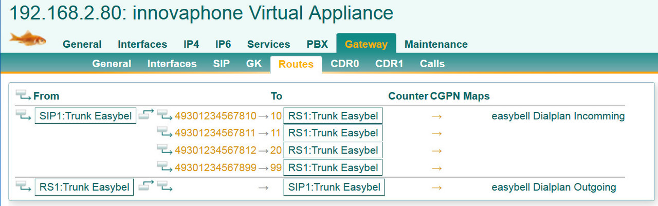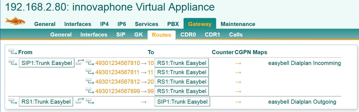- Gateway > Routes > Trunk <> SIP1 Trunk RS1