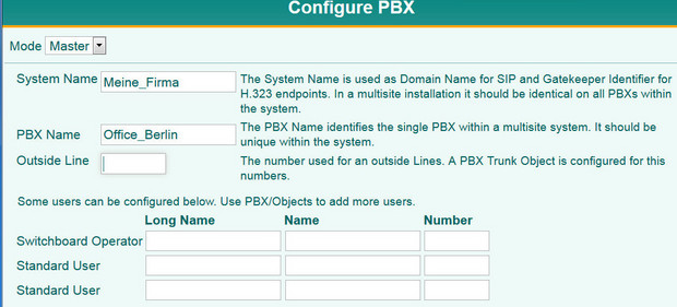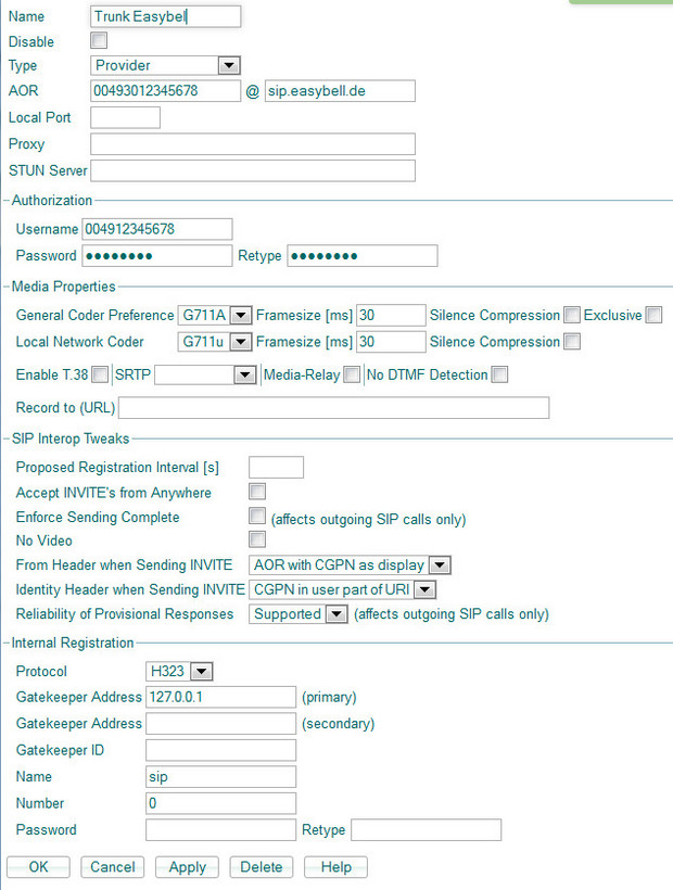 Hinweis: Die hier eingetragene „Number“ ist die Amtskennziffer. Sollte eine andere gewünscht werden, muss unter Gateway > SIP > SIP1 Trunk > internal Registration unter Parameter „Number“ diese Nummer abgeändert werden.