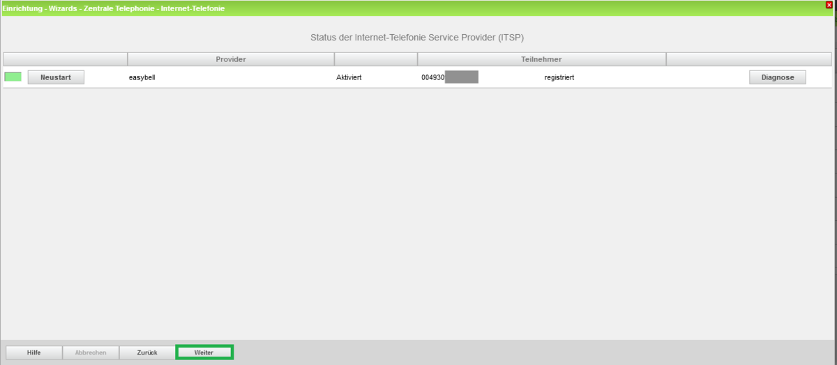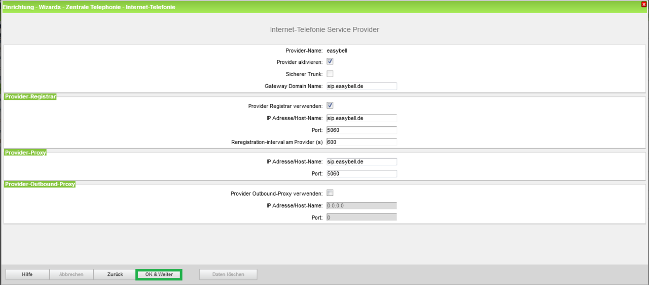 Sie können die folgenden Bildschirme überspringen, indem Sie jeweils auf „OK & Weiter“ klicken, bis Sie wieder zur „Provider-Konfiguration und -Aktivierung“ gelangen (siehe Punkt 3).
