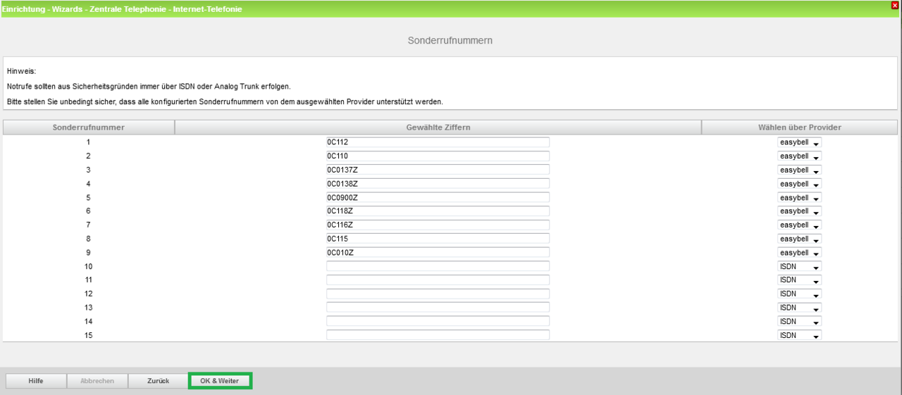 Im nächsten Schritt können Sie Sonderrufnummern erstellen und ggf. deren Routing mit „Wählen über Provider“ angepasst werden. Wenn Sonderrufnummern nicht über die ITSP-Richtung geroutet werden sollen, ist das entsprechend zu ändern.