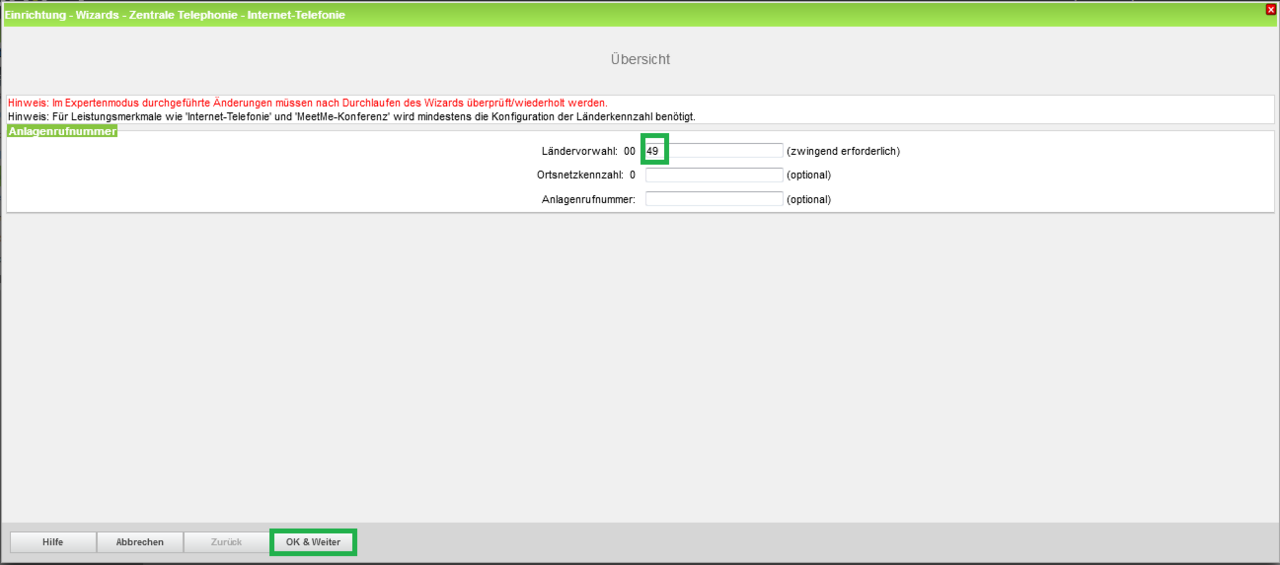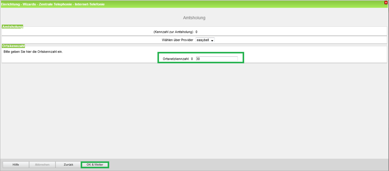 Auf der folgenden Seite wird die Richtung für die Standardamtsbelegung festgelegt und die Ortsnetzkennzahl abgefragt (notwendig für die Wahl im eigenen Ortsnetz). Die Ortsnetzkennzahl ist ohne Präfix (0) einzugeben, also bspw. „30“ für Berlin.
