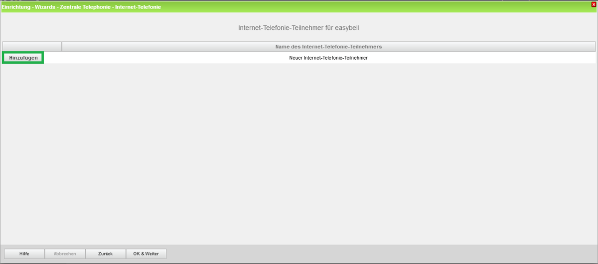 Klicken Sie im nächsten Fenster bitte zunächst auf „Hinzufügen“ um die Eingabemaske für die VoIP-Zugangsdaten Ihres easybell-Anschlusses zu öffnen.