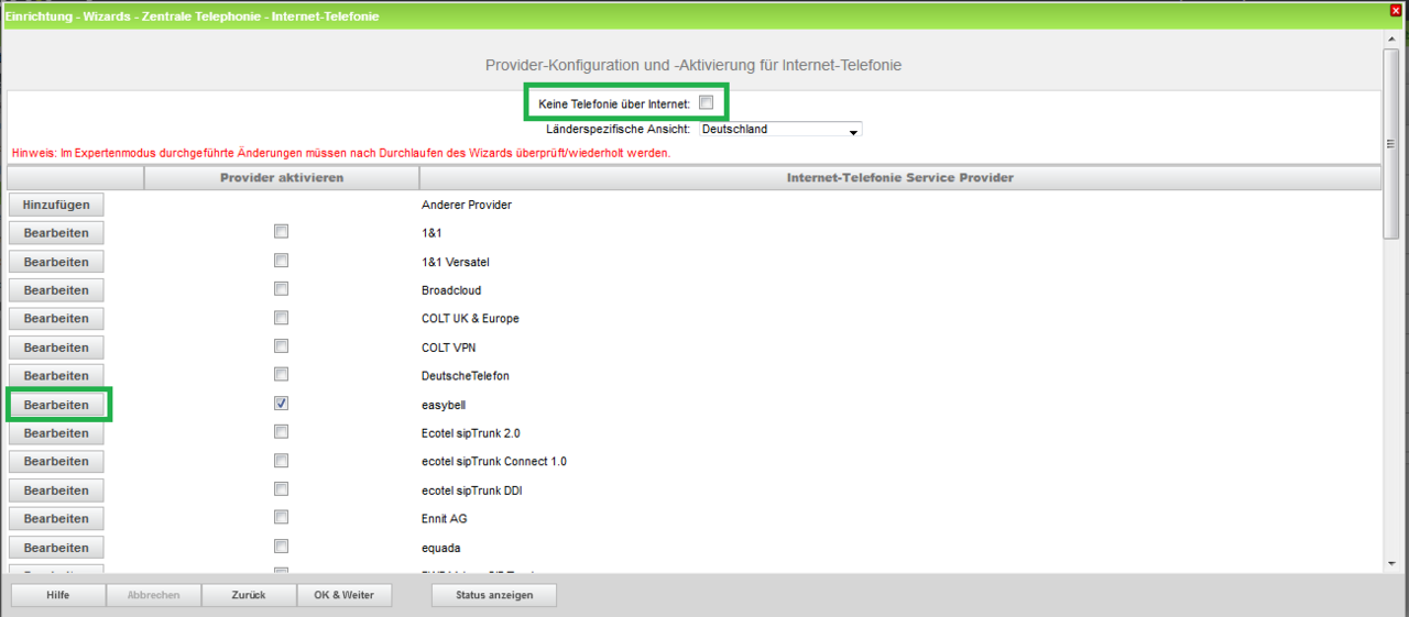 Wählen Sie dann bei „Länderspezifische Ansicht“ „Deutschland“ aus. Setzen Sie anschließend ein Häkchen neben „easybell“ und klicken dort dann auf „bearbeiten“.