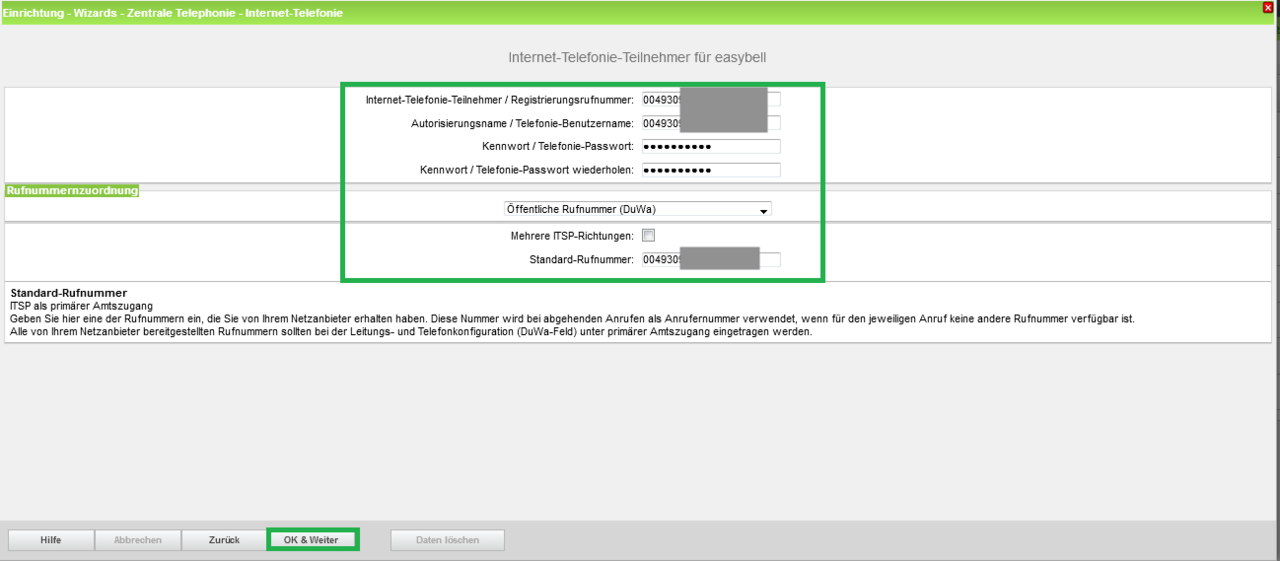 Tragen Sie bitte die Informationen aus Ihrem easybell-Kundenportal wie folgt ein: