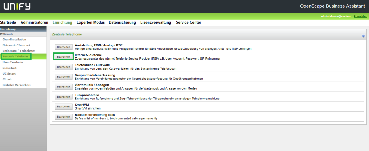 Öffnen Sie die Benutzeroberfläche der OpenScape und wählen Sie unter „Wizards“ den Punkt „Zentrale Telefonie“.