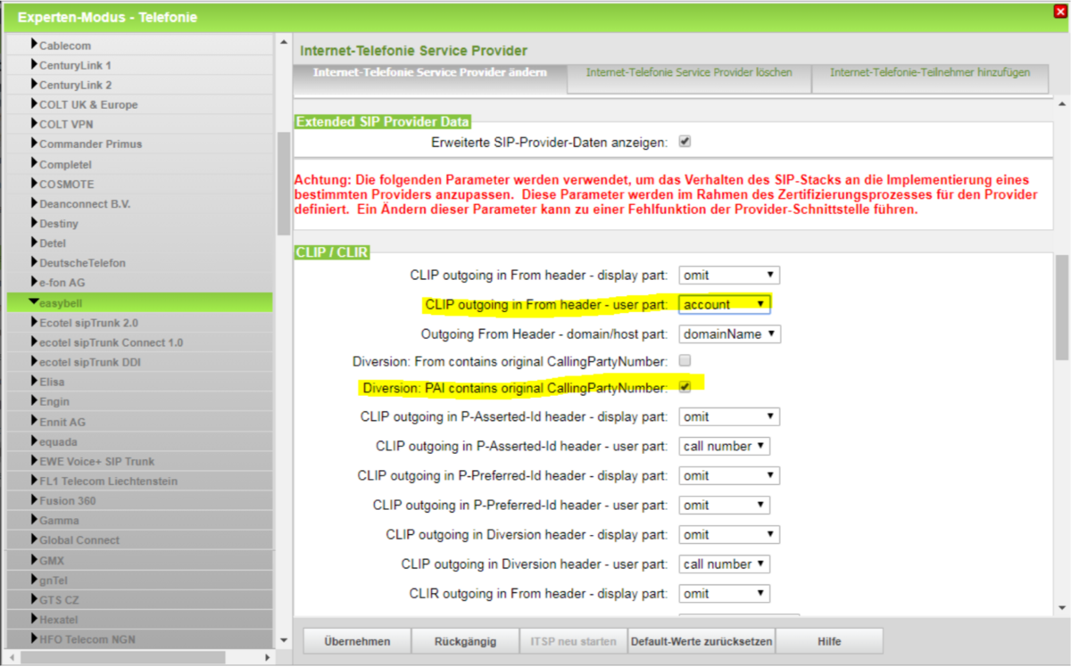 Gehen Sie dafür in den Unify-Einstellungen zu Experten Mode → Telefonie → Sprachgateway → Internet-Telefonie Service Provider und bearbeiten Sie das Profil „easybell“ wie folgt: