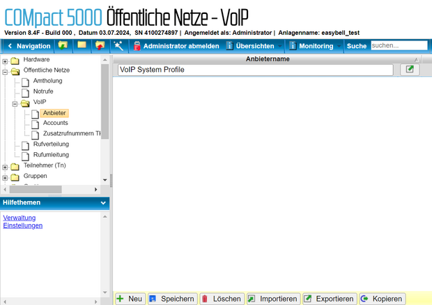 Öffnen Sie in der Navigationsleiste „Öffentliche Netze“ → „VoIP“ → „Anbieter“ und klicken Sie auf „Importieren“.