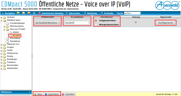 Die Konfiguration Ihres easybell Trunks ist damit abgeschlossen. Sie können nun fortfahren und zum Beispiel die „Teilnehmer (Tn)“ (wie Systemtelefone, SIP-Telefone, Fax-Nebenstellen, etc.) und weitere Funktionen der Auerswald Telefonanlage einrichten.