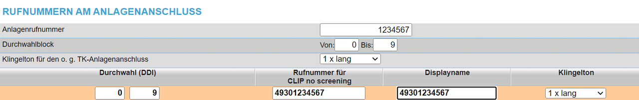 Anlagenrufnummer: 1234567 (Kopfnummer ohne Landeskennzahl und ohne Ortsvorwahl)