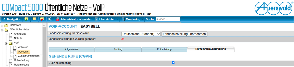 Es erscheint ein neues Fenster. Gehen Sie bitte zum Reiter „Rufnummernübermittlung“ und aktivieren Sie CLIP no screening.