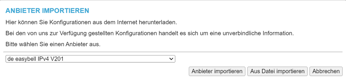 In dem sich nun öffnenden Fenster wählen Sie „de_Easybell_IPv4_V201“. Für die verschlüsselte Telefonie wählen Sie das Profil „de_easybell_IPV4_SIPS_V204“.