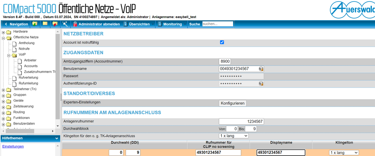 Die Konfiguration Ihres easybell Trunks ist damit abgeschlossen. Sie können nun fortfahren und zum Beispiel die „Teilnehmer (Tn)“ (wie Systemtelefone, SIP-Telefone, Fax-Nebenstellen, etc.) und weitere Funktionen der Auerswald Telefonanlage einrichten.