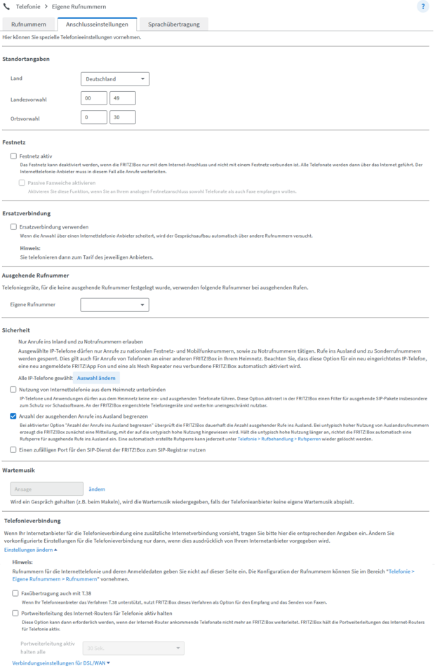 Klicken Sie unter „Telefonie“ → „Eigene Rufnummern“ und dann auf „Anschlusseinstellungen“.