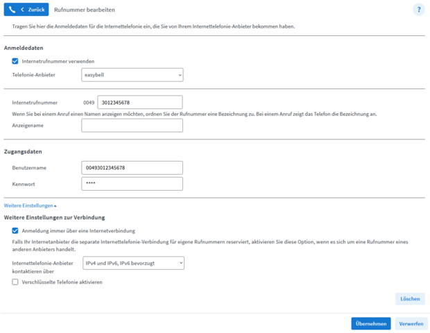 Klicken Sie auf „Telefonie“ → „Eigene Rufnummern“ und dann in der Registerkarte „Rufnummern“ bei der betroffenen Rufnummer auf „Bearbeiten“.