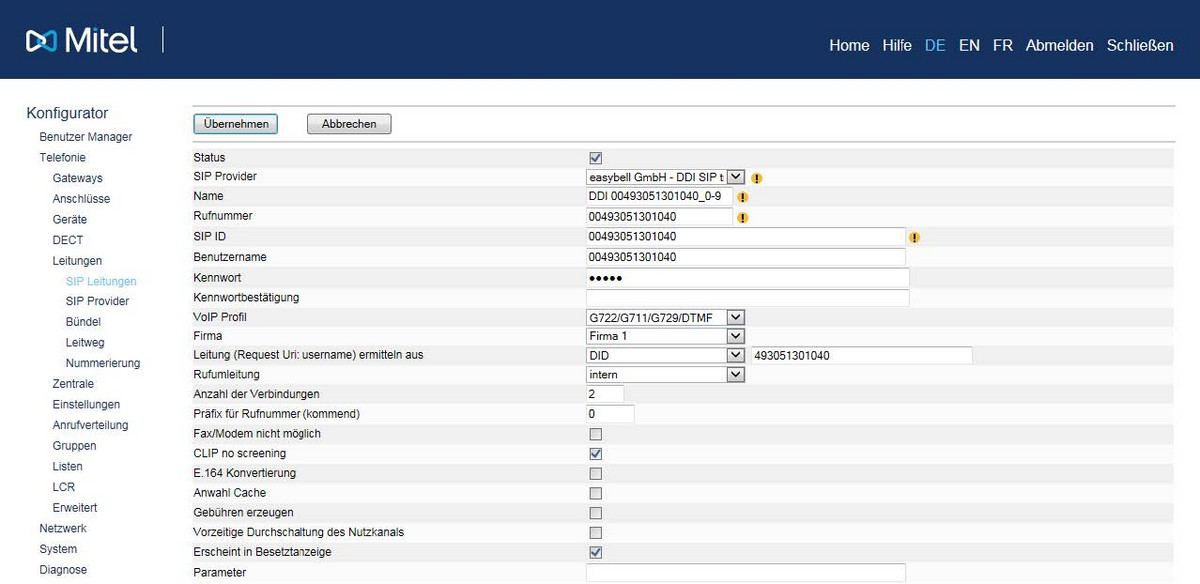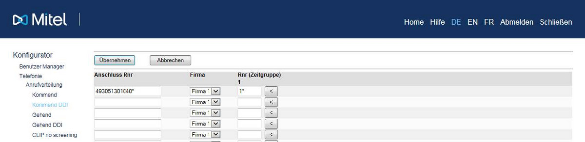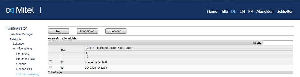 Gehen Sie in der Mitel-Telefonanlage in das Menü „Telefonie“ → „Anrufverteilung“ → „CLIP no screening“.