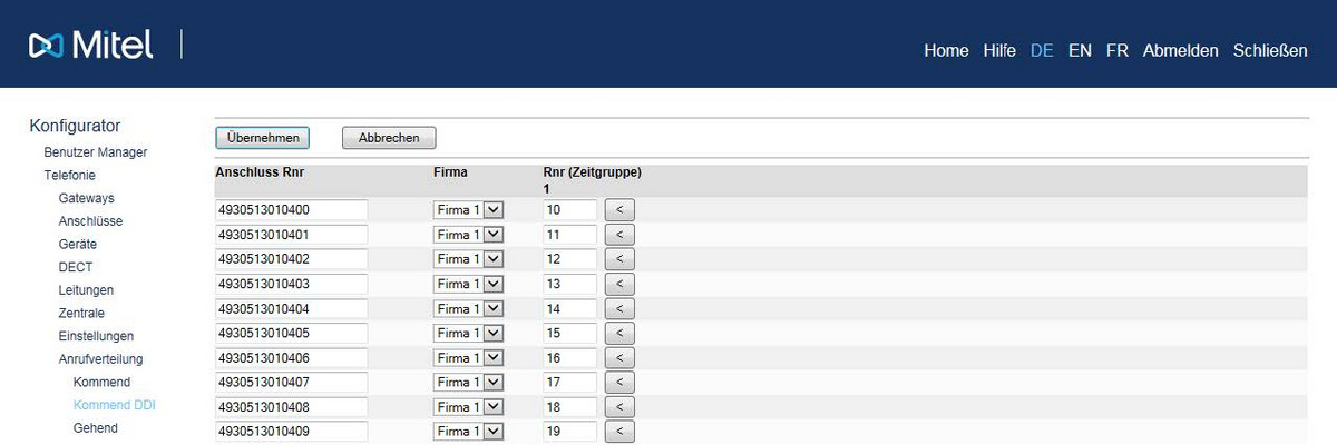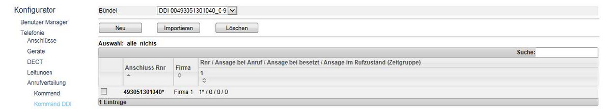 Die kommende Anrufverteilung kann via 1:1 Mapping, DDI auf interne Nebenstelle vorgenommen werden, wenn die DDI der internen Nebenstellenrufnummer entspricht.