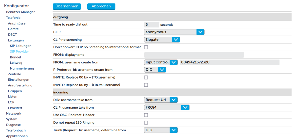 SIP-Provider-Einstellungen „outgoing“