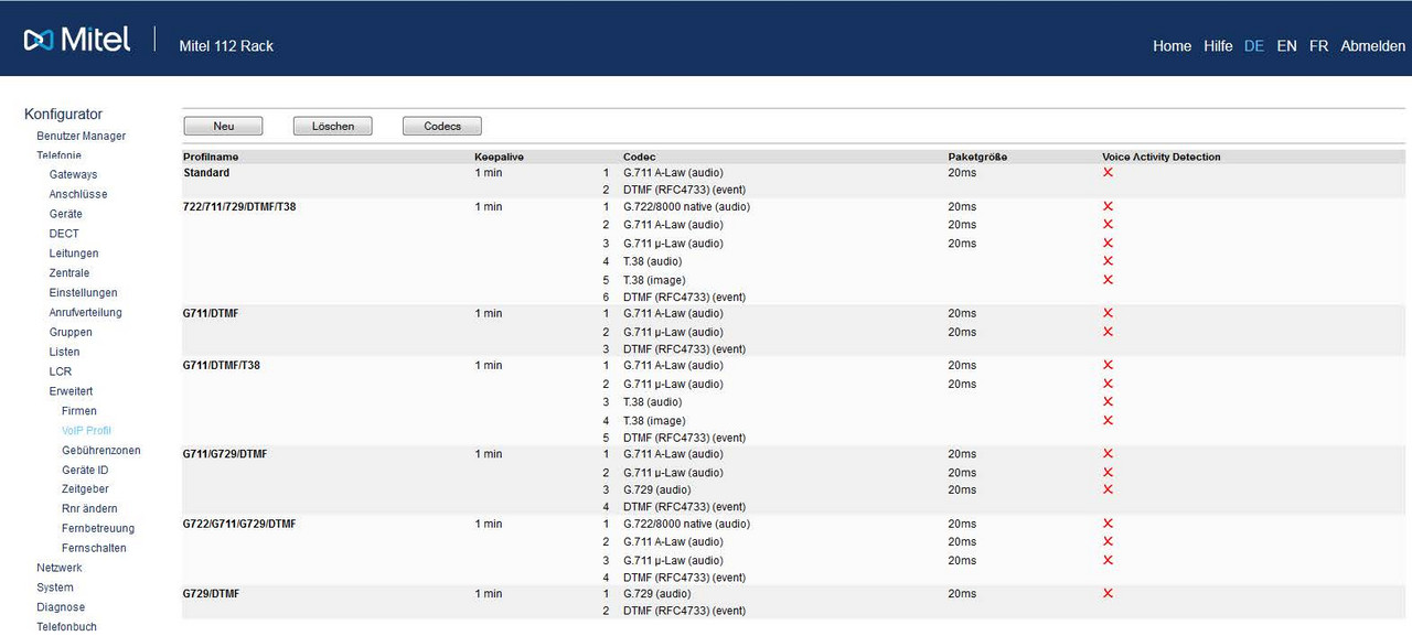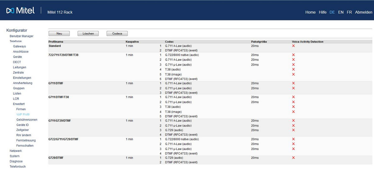 Daher sollte das der SIP-Leitung zugeordnete VoIP-Profil nur die Codecs enthalten, die auch wirklich mit dem Provider und dem verwendeten PBX Typ genutzt werden können.