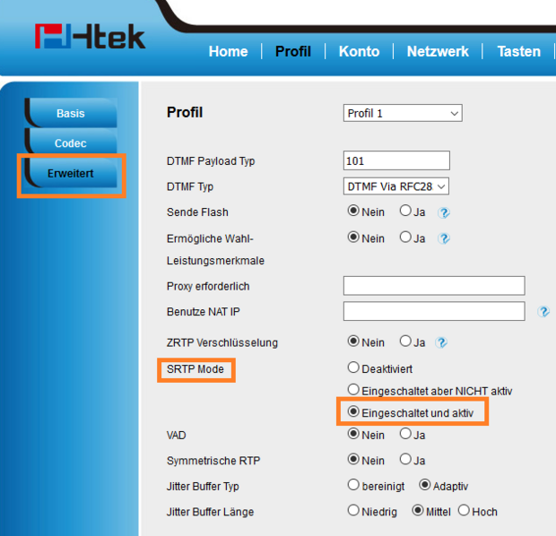 Wählen Sie im Menü „Profil“ das jeweilige Profil aus, für welches Sie SRTP aktivieren möchten.