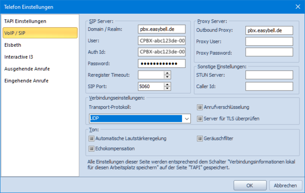 Befüllen Sie die Felder bitte mit den SIP-Zugangsdaten aus Schritt 2.
