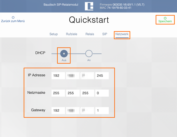 Im Quickstart-Menü wechseln Sie bitte in den Reiter „Netzwerk“ und geben die gewünschten Netzwerkdaten ein. Wir empfehlen die DHCP-Option zu deaktivieren. Mit einem Klick auf „Speichern“ sichern Sie die Einstellungen.