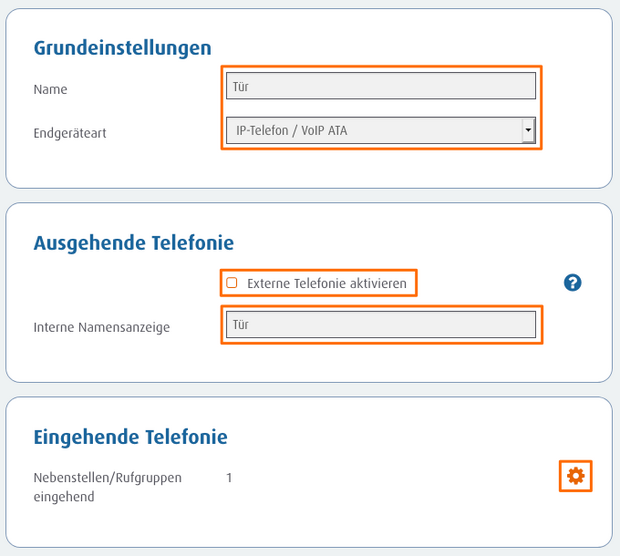 Der Name ist als „Tür“ festgelegt, als Endgeräteart nutzen Sie bitte „IP-Telefon/ VoIP ATA“.