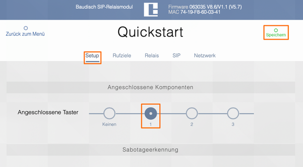 Unter dem Reiter „Setup“ definieren Sie nun die Anzahl der angeschlossenen Taster (Klingelknöpfe). Auch hier müssen die Einstellungen mit „Speichern“ gesichert werden.