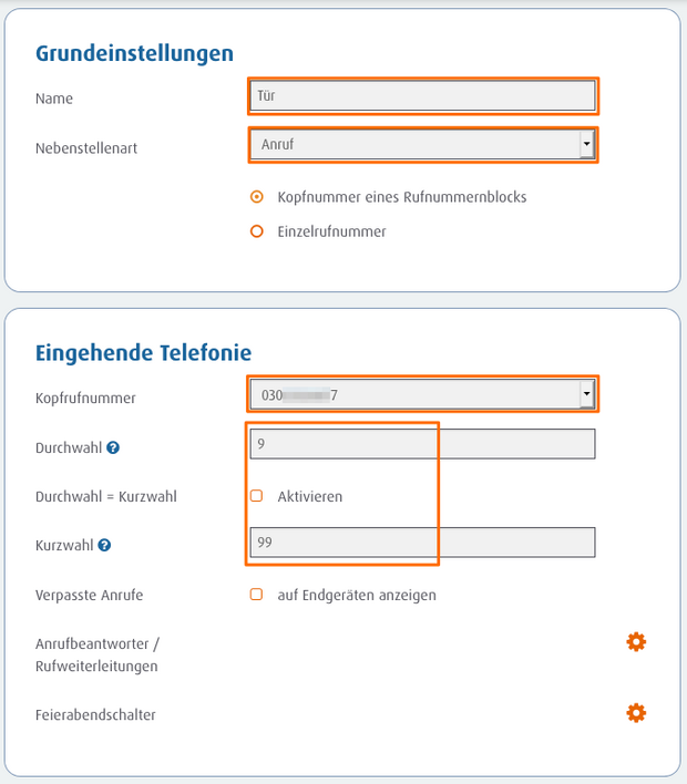 - Nummer: interne Kurzwahl der Nebenstelle oder Gruppe