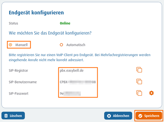 - SIP-Authentifizierungs-PIN: das Kennwort, welches für das Endgerät in der Cloud Telefonanlage vergeben wurde