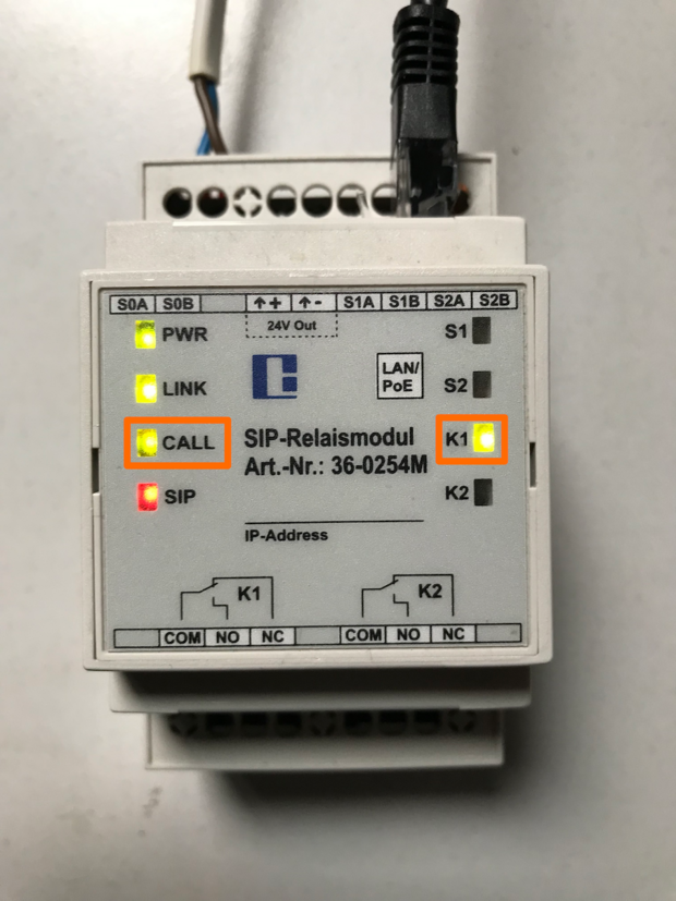 - Die Nebenstelle(n), welche für die Funktion konfiguriert sind, sollten nun klingeln. An dem SIP-Modul leuchtet die LED „CALL“ auf.