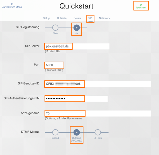 Sollten Sie sich nicht sicher sein, wie die Daten in Ihrem Fall lauten, finden Sie diese in den Einstellungen des Endgerätes für die "Tür", welches Sie in der Cloud Telefonanlage angelegt haben.