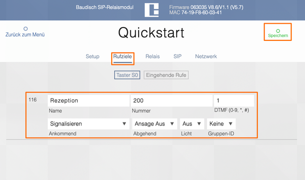 Nun können Sie im Reiter „Rufziele“ die Nebenstellen festlegen, welche durch Druck auf den Klingelknopf angerufen werden sollen. Diese können einzelne Telefone oder Gruppierungen sein. Wichtig ist, dass Sie am Ziel „116“ die interen Kurzwahl der Nebenstelle oder Gruppe angeben.
