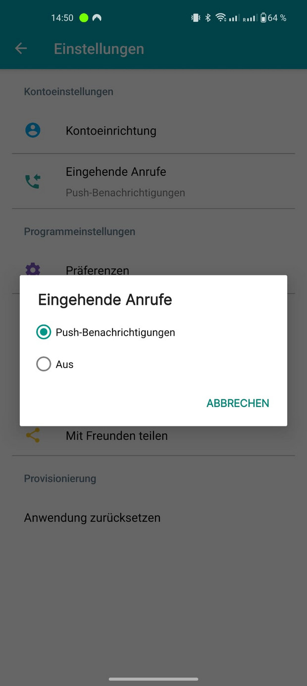 Dort können Sie die Push-Benachrichtigungen für eingehende Anrufe Ein- oder Ausschalten