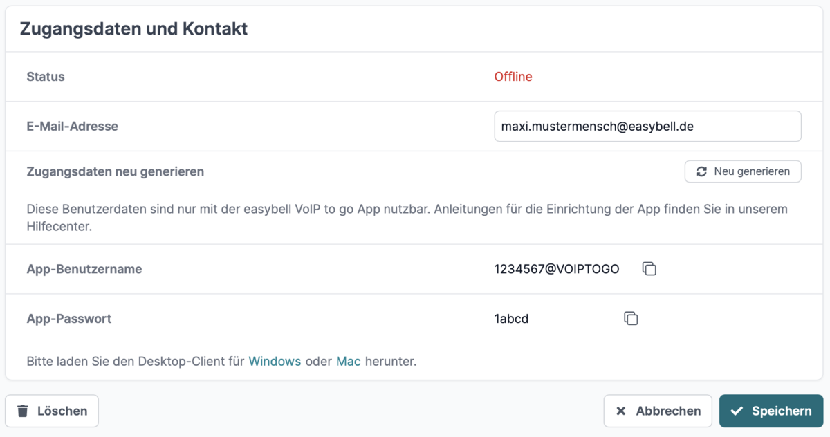 Wenn alle Angaben vollständig sind, können Sie im Abschnitt „Endgerät konfigurieren“ auf den Button „Speichern und Zugangsdaten generieren“ klicken.Nun sehen Sie die Zugangsdaten für dieses Endgerät.