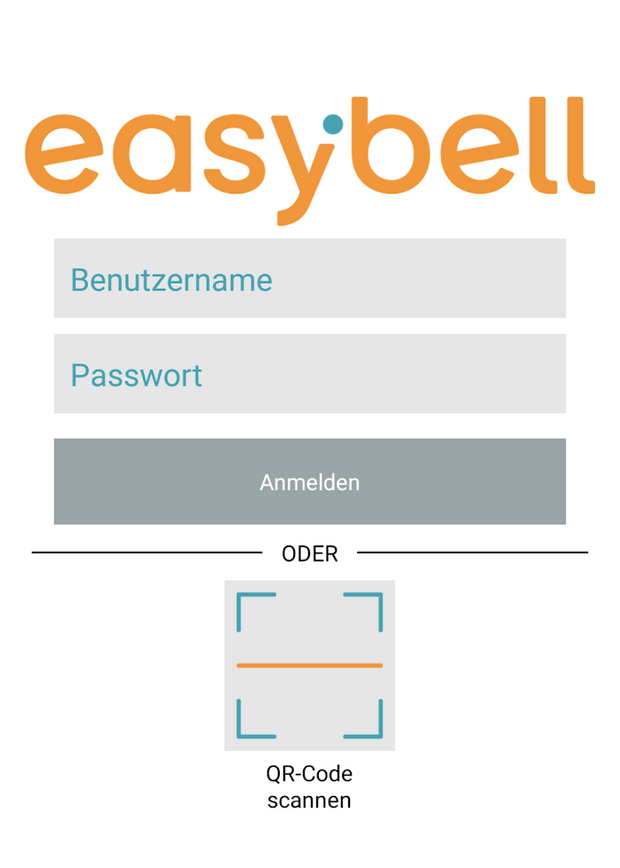 Öffnen Sie die Easybell-App auf Ihrem Telefon. Beim ersten Start können Sie zur Anmeldung den QR-Code einscannen oder Sie geben die angezeigten Daten händisch ein.