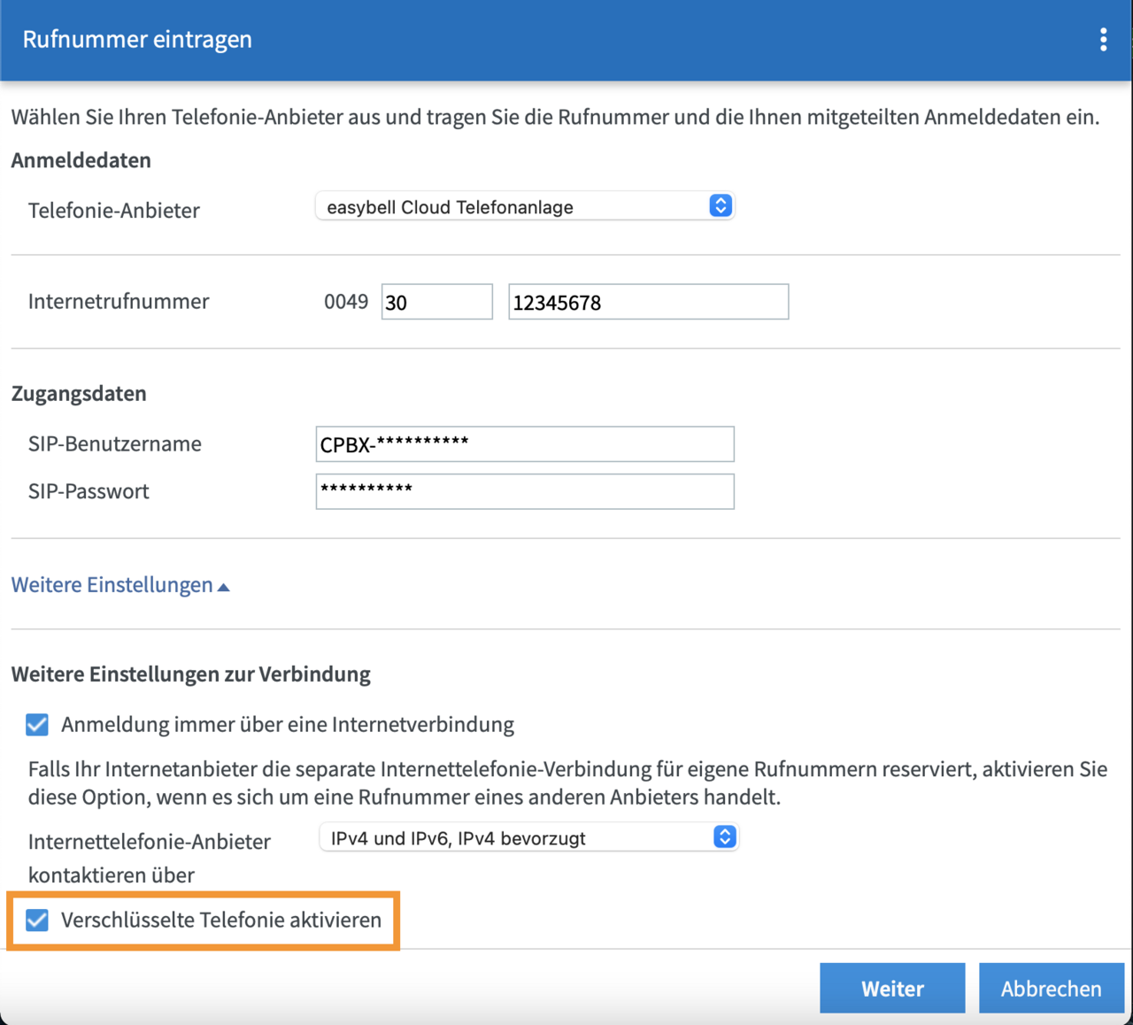 - SIP-Passwort: können Sie aus dem Kundenportal übernehmen.