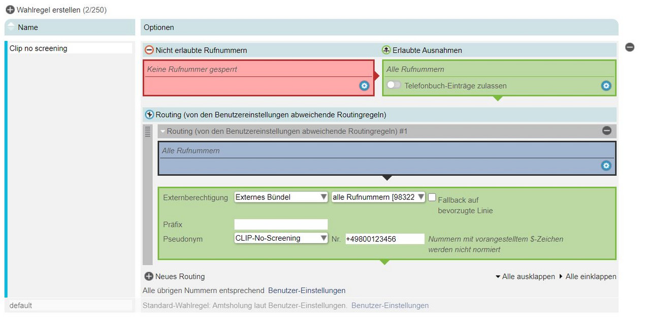 Legen Sie eine neue Wahlregel mit Typ Clip no screening als Pseudonym und der gewünschten Nummer an.
