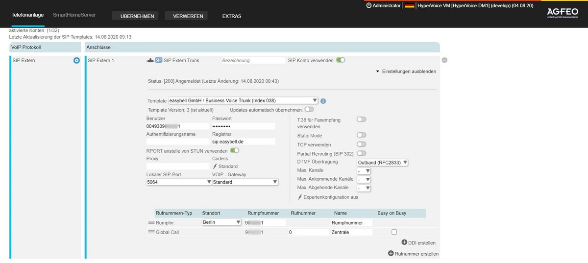 - Bitte achten Sie unbedingt darauf, dass für die Einrichtung das aktuelle Template für easybell Trunks genutzt wird. Die Agfeo Telefonanlage erkennt dies in der Regel am eingetragenen Registrar „sip.easybell.de“.