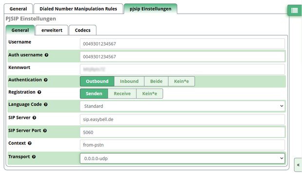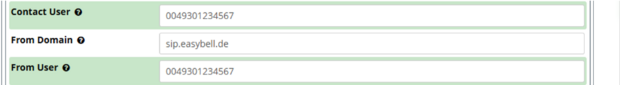 - Contact User: Kopfrufnummer Ihres Trunks im internationalen Format (z.B. 0049301234567)