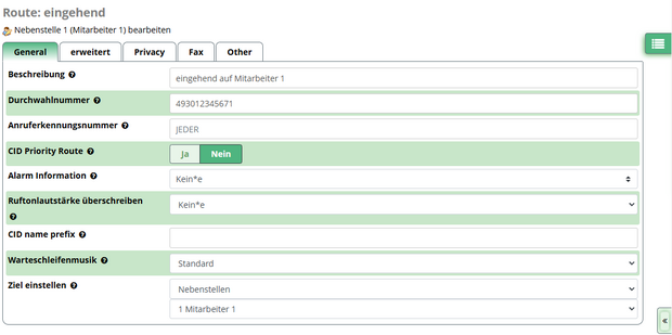 - Route CID: Die Rufnummer, die ausgehend angezeigt werden soll, wenn die verwendete Extension keine Einstellung dazu hinterlegt hat.