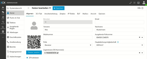 In der 3CX-Weboberfläche gehen Sie bitte in die Einstellungen des jeweiligen Nutzers. Hier kann im Feld „Ausgehende Rufnummer“ die gewünschte Nummer eingetragen werden.