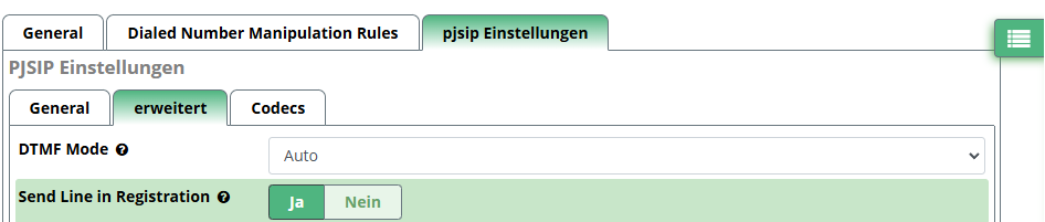 Öffnen Sie nun den Reiter „Erweitert“ in den pjsip-Einstellungen und passen Sie die Kofiguration wie folgt an: