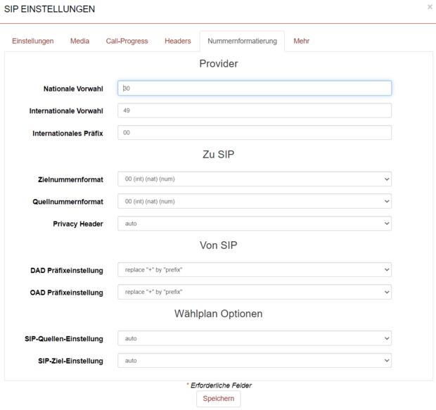 Außerdem müssen die Einstellungen unter „Nummernformatierung“ / „zu SIP“ wie folgt geändert werden: