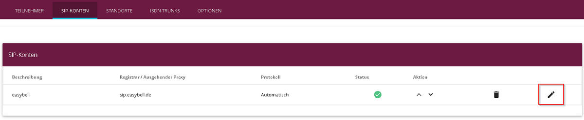 Wechseln Sie nun links zum Reiter „VoIP“ und anschließend auf „Einstellungen“. Im neu geöffneten Fenster wählen Sie das Feld „SIP-Konten“ aus. Hier sehen Sie das bereits eingerichtete SIP-Profil und bearbeiten dieses über das Stift-Symbol.
