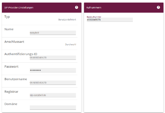 Bei Basisrufnummer geben Sie die Anlagenrufnummer ein, hier z. B. 4930345678. Bitte beachten Sie hierbei, dass in der Ländervorwahl keine führenden Nullen oder ein + eingetragen